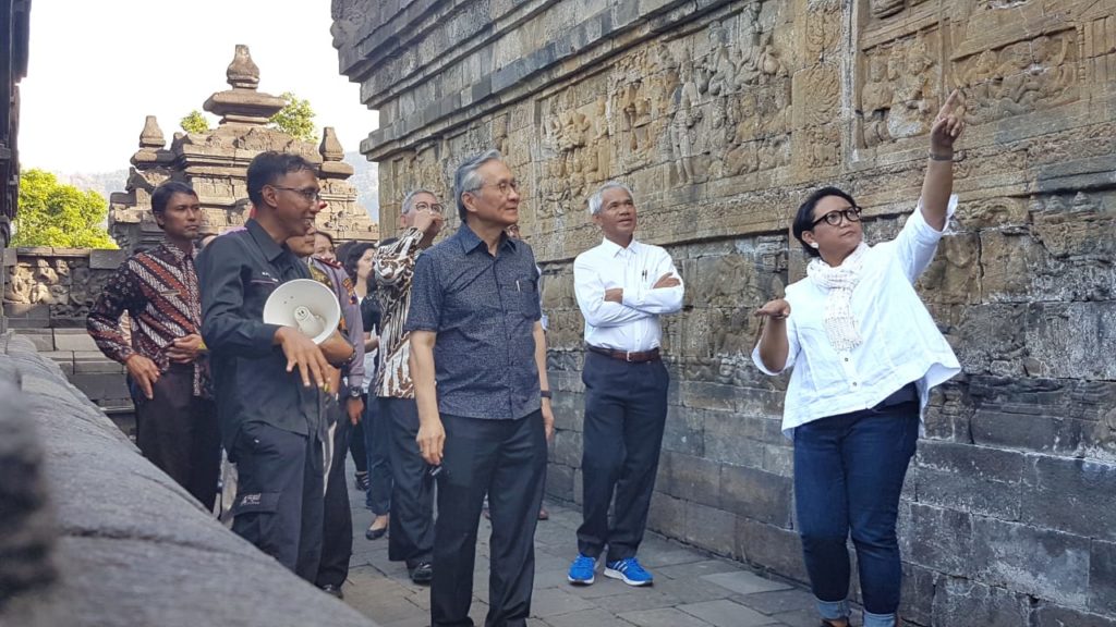 Indonesian Foreign-Affairs Minister Mrs. Retno Marsudi invited Thai Minister of Foreign Affairs HE. Mr. Don Pramudwinai to Borobudur Temple, Magelang District, Central Java, Friday (6/7/2018) afternoon. Both have just held a bilateral meeting titled “The 9th Joint Commission Meeting (JCM)” in Yogyakarta. About 30 minutes, the group toured the temple.